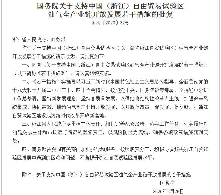 3月31日,國(guó)務(wù)院發(fā)布《支持中國(guó)(浙江)自由貿(mào)易試驗(yàn)區(qū)油氣全產(chǎn)業(yè)鏈開(kāi)放發(fā)展若干措施的批復(fù)》。