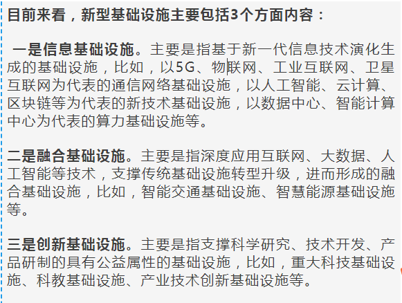 “新基建”近來引起輿論關(guān)注,但關(guān)于“新基建”的概念尚未明晰。4月20日,國家發(fā)改委作出權(quán)威解讀,目前來看,“新基建”包括信息基礎(chǔ)設(shè)施、融合基礎(chǔ)設(shè)施和創(chuàng)新基礎(chǔ)設(shè)施三方面。