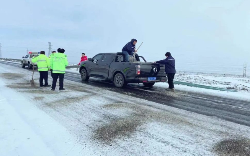 當天,藍天誠達員工還配合交警阿樂惠中隊、黑山中隊共同對結(jié)冰路面進行撒鹽作業(yè),中午14 點 ,道路恢復(fù)正常通行。雪花片片,寒風(fēng)呼嘯,水壺里的開水升騰著熱氣,驅(qū)散了雪地中等待的孤寂,更溫暖了每一位駕駛員的心,藍天誠達用實際行動逆風(fēng)而行,不畏嚴寒 ,保障每一位在路上人員的安全。