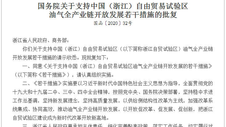 加快舟山石化基地建設(shè),打造LNG接收中心!國(guó)務(wù)院支持浙江自貿(mào)區(qū)油氣全產(chǎn)業(yè)鏈開(kāi)放發(fā)展